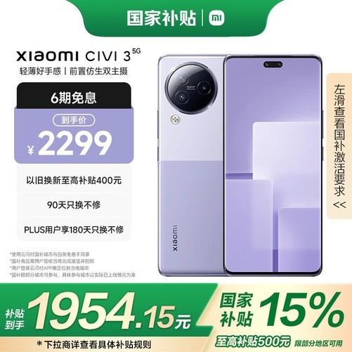 小米Civi 3 5G手机京东国补15%优惠仅1944元